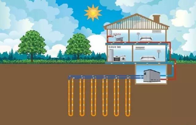 “熱泵”二字說明它是熱泵的一種,具有熱泵的共同特點,其工作過程具體如下,夏季制冷時,大地作為排熱場所,把室內熱量以及壓縮機耗能通過埋地盤管排入大地中,再通過土壤的導熱和土壤中水分的遷移把熱量擴散出去。冬季供熱時,大地作為熱泵機組的低溫熱源,通過埋地盤管獲取土壤中熱量為室內供熱。兩個換熱器都即可作冷凝器又可作蒸發器,只因季節不同而功能不同。在地源熱泵系統中,由于冬季從大地中取出的熱量可在夏季得到補償,因而可使大地的熱量基本維持平衡。