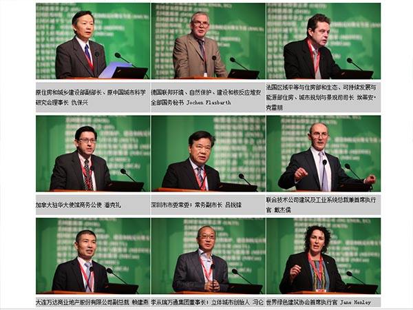 大會在28日上午九點整準時開始,由國家住房和城鄉建設部副部長仇保興主持,貴州省人民政府副省長慕德貴、加拿大駐華大使商務公使潘克禮、深圳市常務副市長呂銳鋒、聯合技術公司建筑及工業系統總裁兼執行官戴杰儒、方興地產(中國)有限公司總經理李從瑞向大會致辭。德國聯邦環境、自然保護、建設和核反應堆安全部國務秘書Jochen Flasbarth;法國區域平等與住房部和生態、可持續發展與能源部住房、城市規劃與景觀司司長埃蒂安?克雷朋;大連萬達商業地產股份有限公司副總裁賴建燕;萬通投資控股股份有限公司、北京萬通立體之城投資有限公司董事長馮侖;世界綠色建筑協會執行官Jane Henley出席開幕式,并發表演講。
